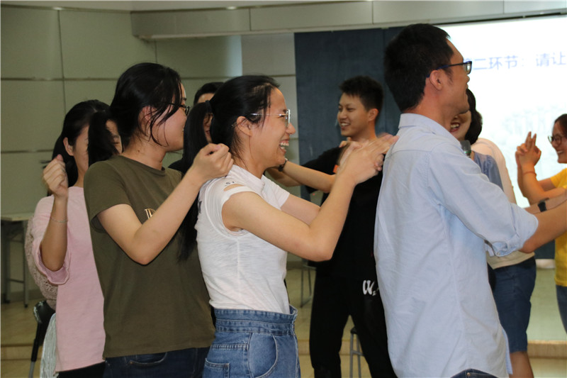 活動(dòng)在勵(lì)志歌曲“追夢(mèng)赤子心”的音樂聲中拉開序幕。大家在指導(dǎo)老師的引領(lǐng)下,分成二個(gè)小組共同進(jìn)入“大風(fēng)吹”“請(qǐng)讓我為你按摩一下下”“優(yōu)點(diǎn)轟炸”“銜紙杯傳水”