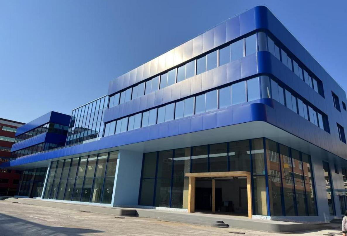 建筑美學:建筑內(nèi)部空間流動活潑,以多維度的層次感與流動性喚醒豐富的空間體驗;建筑外立面采用橫向條形玻璃窗與啞光藍色鋁板交替構(gòu)成,形成簡潔的現(xiàn)代韻律。同時中庭的空間構(gòu)架在光影交織中勾勒出虛實交錯的幾何敘事。