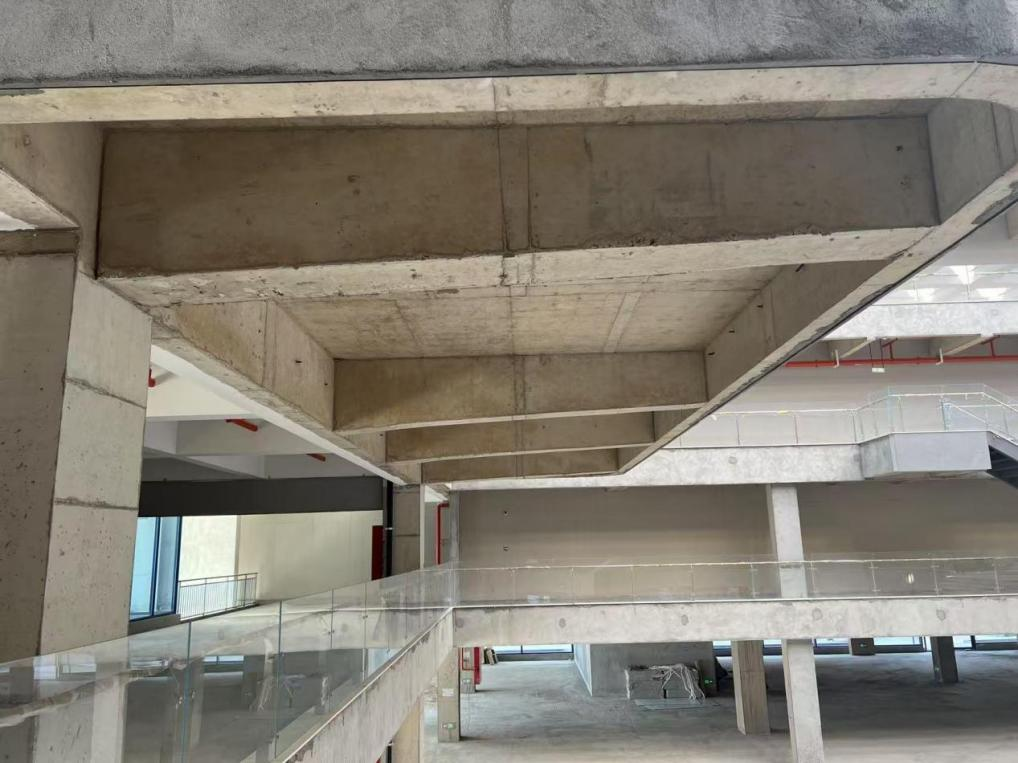 技術(shù)創(chuàng)新:通過對撓度和裂縫進行控制,達到砼框架結(jié)構(gòu)6米大懸挑的要求;采用寬扁梁以及給排水管道穿梁的做法解決要求最大凈空的要求;中庭采用24米大跨度井字梁結(jié)構(gòu)。